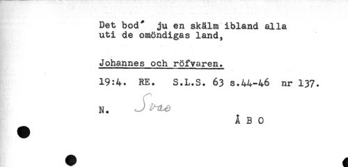 //// * * "" * " * ' * - - - --- - - - * //// ' - -....... " .....- ^ //// Det bod^ ju en skälm ibland alla //// uti de omöndigas land, //// - - . ...... //// Johannes och röfvaren. //// 19:4. RE. S.L.S. 63 s.44-46 nr 137. //// f //// N. J //// ÅBO ////
