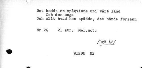 //// Det bodde en spåqvinna uti vårt land //// Och den unga //// Och allt hvad hon spådde, det hände försann //// Nr 24 21 str. Mel.not. //// /DgF 42 //// /^ WIEDE MS ////