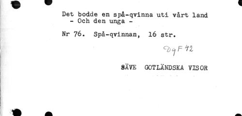 //// Det bodde en spå-qvinna uti vårt land //// - Och den unga - //// Nr 76. Spå-qvinnan, 16 str. //// SÄVE GOTLÄNDSKA VISOR //// ' " * - ////