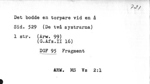//// - - . . ^ //// i //// t //// Det bodde en torpare vid en å //// Sid. 529 (De två systrarna) //// 1 str. (Arw. 99) //// (G.Afz.II 16) //// DGF 95 Fragment //// - i //// i //// t //// ARW. MS Vs 2:1 //// t //// t- ////