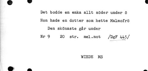 //// ^ HF — //// B;. . //// Det bodde en enka allt söder under ö //// HjwM*^** ** //// Hon hade en dotter som hette Malmofrö //// Den skönaste går under //// Nr 9 20 str. mel.not /DgF 445 //// /* *. //// WIEDE MS ////