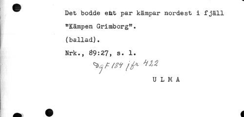 //// Det bodde eht par kämpar nordest i fjäll //// "Kämpen Grimborg". //// (ballad). //// Nrk., 89:27, s. 1. //// U L M A ////