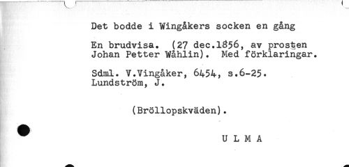 //// Det bodde i Wingåkers socken en gång //// En brudvisa. (27 dec.1356, av prosten //// Johan Petter Wåhiin). Med förklaringar. //// Sdml. V.Vingåker, 6454, s.6-25. //// Lundström, J. //// (Bröllopskväden). //// C'-' å^) //// U L M A //// ** ////