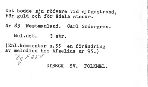 //// Det bodde sju röfvare vid sjögestrand, //// För guld och för ädela stenar. //// Nr 83 Westmanland. Carl Södergren. //// ! //// Mel.not. 3 str. //// i //// (Enl.kommentar s.55 en förändring } //// av melodien hos Afzelius nr 95.) //// DYBECK SV. FOLKMEL. ! //// i //// i //// = ////