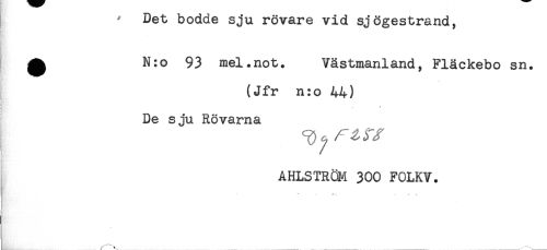 //// } ' Det bodde sju rövare vid sjögestrand, //// ^ N:o 93 mel.not. Västmanland, Fläckebo sn //// (Jfr n:o 44) //// De sju Rövarna //// AHLSTRÖM 300 FOLKV. ////