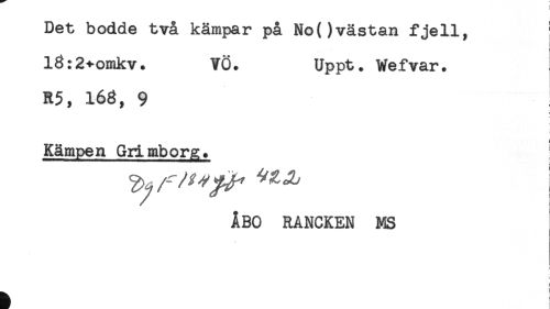 //// Det bodde två kämpar på No()västan fjell, //// l8:2+omkv. VÖ. Uppt. Wefvar. //// R5, 168, 9 //// Kämpen Giimborg. //// ÅBO RANCKEN MS //// ! //// ! ////