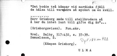 //// "Det bodde två kämpar vid nordiska fjäll //// de hälsa till varqndra så mycket om en kväll. //// Herr Grimborg sade till stallbrodern så //// å har du intet lust till gifta dig än"... //// * //// (Grimborgsvisan). Fon.skr. //// - //// Vrml. Dalby, 517:432, s. 37-39. //// Samuelsson, S. //// * (Kämpen Grimborg). //// U L M A ////