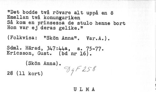 //// "Det bodde två rövare alt uppå en ö //// Emellan två konungariken //// Så kom en prinsessa de stulo henne bort //// Hon var ej deras gelike." //// (Folkvisa: "Skön Anna". Var.A.). //// . //// Sdml. Härad, 347:44a, s. 75-77. //// Ericsson, Gust. (bd nr 16). //// (Skön Anna). //// 23(llksrH ^^ //// i- //// s //// TT T M A = ////