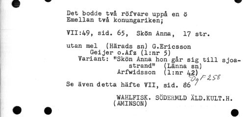 //// Det bodde två röfvare uppå en § //// Emellan två konungariken; //// VII:49, sid. 65, Skön Anna, 1? str. //// utan mel (Härads sn) G.Ericsson //// Geijer o.Afz (l:nr 5) //// Variant: "Skön Anna hon går sig till sjoa- //// strand" (Länna sn) //// Arfwidsson (l:nr 42) , „ //// Se även detta häfte VII, sid. 86 //// /WAHLFISK. SÖDERMLD ÄLD.KULT.H. //// (AMINSON) ////
