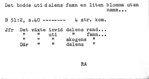 //// ueu Doaae u^i aaiens lamn en Aiuen ujLonunct uucui //// namn... //// B 51:2, s.40 -—---- 4 str. kom. //// Jfr Det växte invid dalens rand... //// " " uti " famn... //// " " " skogens " //// Där " " dalens " //// RÅ //// ___ -....... . _____ . . . .... ....^^ ////