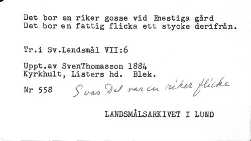 //// Det bor en riker gosse vid Ehestiga gård //// Det bor en fattig flicka ett stycke derifrån. //// Tr.i Sv.Landsmål VII:6 //// Uppt.av SvenThomasson 1384 //// Kyrkhult, Listers hd. Blek. //// LANBSMÅLSARKIVET I LUND //// ^ _____. ___J ////