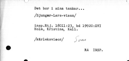 //// Det bor i mina tankar... //// /Sjunger-Lars-visan //// /insp.Rtj. 16011:23, bd 19920:XVI //// Holm, Kristina, Kall. //// /kärleksvisor //// /t //// ^ RA INSP. ////