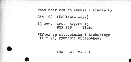 //// ; --- ..... //// } //// " * //// Thet boor ock en änckia i breden by //// Sid. 93 (Helleman unge) //// - — ^ -, //// 13 str. Arw. tryckt 15 //// DGF 293 Visb. //// "Efter en uppteckning i Linköpings //// (Alf 45) gymnasii bibliothek. //// ARW MS Vs 2:1 ////
