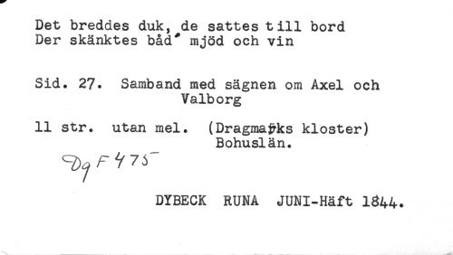 //// Det breddes duk, de sattes till bord //// Der skänktes båd* mjöd och vin //// Sid. 27. Samband med sägnen om Axel och //// Valborg //// 11 str. utan mel. (Dragma&ks kloster) //// Bohuslän. //// DYBECK RUNA JUNI-Häft 1844. //// ^tJi____ ___. ...__———..... ...^... ... . .... ......—... ....-..... . .....- ....... ////