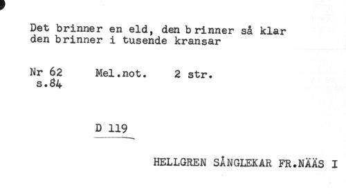 //// Det brinner en eld, den brinner så klar //// den brinner i tusende kransar //// Nr 62 Mel.not. 2 str. //// s.84 //// D 119 //// HELLGREN SÅNGLEKAR FR.NÅÅS I ////