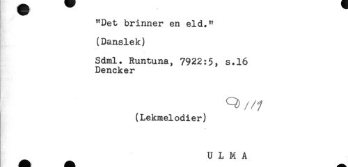 //// "Det brinner en eld." //// (Danslek) //// - //// Sdml. Runtuna, 7922:5, s.16 //// Dencker //// Q) //f //// (Lekmelodier) //// .t- //// U L M A ////