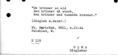 //// "De brinner en eld //// den brinner så stark, //// ^ den brinner med tusende kransar." //// (Sånglek m.be skr.) //// Vb. Barträsk, 8661, s.22-24 //// Palmblad, W. //// D 119 //// U L M A //// Sånglekar ////
