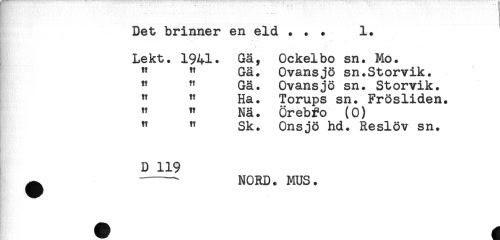 //// Det brinner en eld ... 1. //// 4 " - - //// Lekt. 1941. Gä, Ockelbo sn. Mo. //// " " Gä. Ovansjö sn.Storvik. //// " " Gä. Ovansjö sn. Storvik. //// " " Ha. Torups sn. Frösliden. //// " " Nä. Örebfo (0) //// " " Sk. Onsjö hd. Reslöv sn. //// D 119 //// ^ -' NORD. MUS. ////