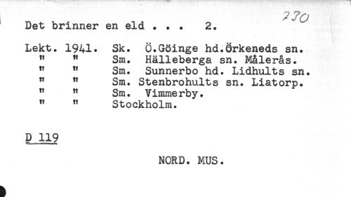 //// Det brinner en eld ... 2. //// Lekt. 1941. Sk. Ö.Göinge hd.Örkeneds sn. //// " " Sm. Hälleberga sn. Malerås. //// " " Sm. Sunnerbo hd. Lidhults sn. //// " " Sm. Stenbrohults sn. Liatorp. //// " " Sm. Vimmerby. //// " " Stockholm. //// D 119 //// NORD. MUS. ////