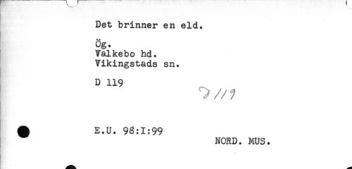 //// . .. //// Det brinner en eld. //// * //// ög. //// Valkebo hd. //// Vikingstads sn. //// D 119 //// ^ E.U. 98:1:99 ////