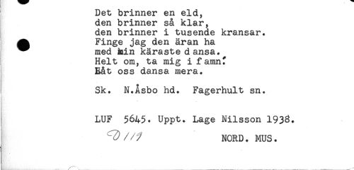 //// Det brinner en eld, //// den brinner så klar, //// den brinner i tusende kransar. //// ^ Finge jag den äran ha //// j ^ med hin käraste dansa. //// ) Helt om, ta mig i famnf //// Båt oss dansa mera. //// Sk. N.Åsbo hd. Fagerhult sn. //// LUF 5645. Uppt. Lage Nilsson 1933. //// NORD. MUS. //// _ ___ _____ ////