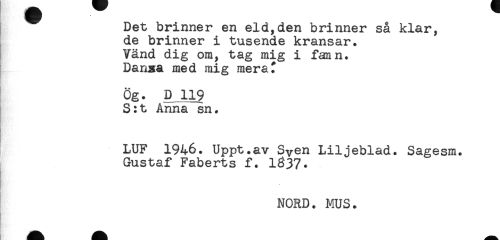 //// Det brinner en eld,den brinner så klar, //// de brinner i tusende kransar. //// Vänd dig om, tag mig i fann. //// Dansa med mig mera^ //// Ög. D 119 //// S:t Anna sn. //// LUF 1946. Uppt.av Sven Liljeblad. Sagesm. //// Gustaf Faberts f. 1337* ////