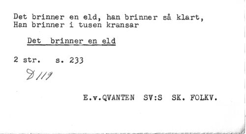 //// Det brinner en eld, han brinner så klart, //// Han brinner i tusen kransar //// Det brinner en eld //// 2 str. s. 233 //// E.v.QVANTEN SV:S SK. FOLKV. //// t //// .. __.... ...^____ .., ...... ////