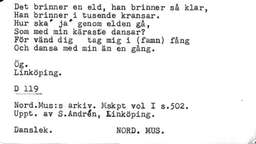 //// J^IC V VA ^ AA , MJL J.AHM3 JL & <3- R-J-GLi , //// Han brinner i tusende kransar. //// Hur ska" ja" genom elden gå, //// Som med min käraste dansar? //// För vänd dig tag mig i (famn) fång //// Och dansa med min än en gång. //// Og. //// Linköping. //// D 119^ //// Nord.Mus:s arkiv. Mskpt vol I s.502. //// Uppt. av S.Andrén, Linköping. //// Danslek. NORD. MUS. //// -_____-.... ...... ; ////