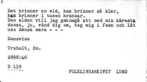 //// Det brinner en eld, han brinner så klar, //// han brinner i tusen kransar. //// Den elden vill jag genomgå att med min kärestg //// dansa, ja, vänd dig om, tag mig i famn och låt //// oss dansa mera - - - //// t //// } //// Dansvisa //// Urshult, Sm. //// 2393:46 //// D 119 //// '-' FOLKLIVSARKIVET LUND ! //// H //// a ////