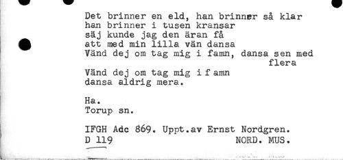 //// Det brinner en eld, han brinner så klar //// han brinner i tusen kransar //// säj kunde jag den äran få //// ^ att med min lilla vän dansa //// Vänd dej om tag mig i famn, dansa sen med //// flera //// Vänd dej om tag mig i f amn //// dansa aldrig mera. //// . //// Ha. //// Torup sn. //// IFGH Adc 369. Uppt.av Ernst Nordgren. //// D 119 NORD. MUS. ////
