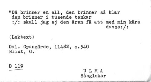 //// "Dä brinner en ell, den brinner så klar //// den brinner i tusende tankar //// :/: skall jag ej den äran få att med min kära //// dansa:/: //// (Lektext) //// Dal. Grangärde, 114&2, s.540 //// Blixt, 0. //// D 119 //// — U L M A //// Sånglekar //// _____ ,, „.... ////