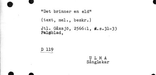 //// "Det brinner en eld" //// (text, mel., beskr.) //// Jtl. Gåxsjö, 2566:1, ä.s.31-33 //// Palmblad, //// D 119 ////