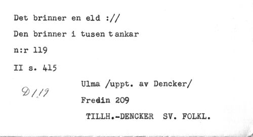 //// Det brinner en eld : //// //Den brinner i tusen t ankar //// n:r 119 //// II s* 415 //// Ulma /uppt. av Dencker //// /^ / //// //Fredin 209 //// TILLH.-DENCKER SV. FOLKL. //// ..... „,.. — __. , __ . .,,„_. , ... ____ . _ .. ^ ////