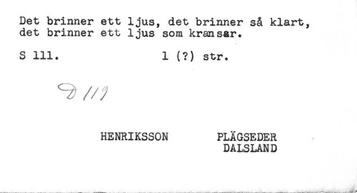 //// Det brinner ett ljus, det brinner så klart, //// det brinner ett ljus som kransar. //// S 111. 1 (?) str. //// HENRIKSSON PLÄGSEDER //// DALSLAND ////