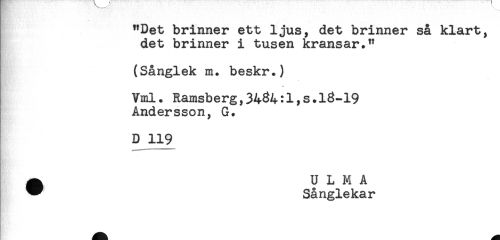 //// "Det brinner ett ljus, det brinner så klart, //// det brinner i tusen kransar." //// (Sånglek m. beskr.) //// Vml. Ramsberg,3484:l,s.18-19 //// Andersson, G. //// D 119 //// ^ U L M A //// * Sånglekar ////