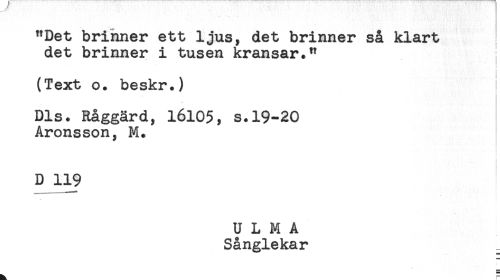 //// "Det brinner ett ljus, det brinner så klart //// det brinner i tusen kransar." //// i //// t //// (Text o. beskr.) ! //// Dis. Råggärd, 16105, s.19-20 //// Aronsson, M. //// t //// D 119 //// U L M A //// Sånglekar //// ^ = ////