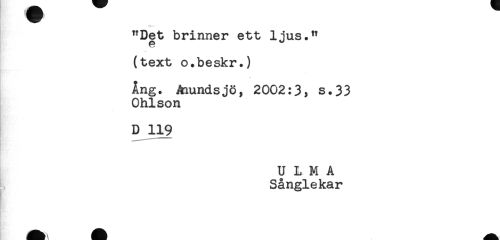 //// J—- //// "Det brinner ett ljus." //// (text o.beskr.) //// Ång. Amndsjö, 2002:3, s.33 //// Ohlson //// D 119 //// U L M A //// Sånglekar ////