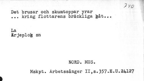 //// Det brusar och skumtoppar yrar //// ... kring flottarens bräckliga ^åt+*. //// i //// La //// Xrjeplo^ sn //// t //// ! //// NORD. MUS. //// Mskpt. Arbetssånger II,s.357.E.U.24127 ////