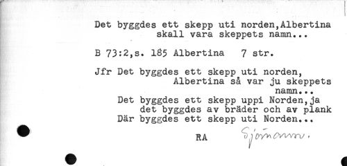 //// Det byggdes ett skepp uti norden,Albertina //// skall vara skeppets namn... //// * ____ //// B 73:2,s. 135 Albertina 7 str. //// Jfr Det byggdes ett skepp uti norden, //// Albertina så var ju skeppets //// namn... //// Det byggdes ett skepp uppi Norden,ja //// det byggdes av bräder och av plank //// Där byggdes ett skepp uti Norden... //// (C ' ^ //// ^ RA D^ ^/i^nrv r ////