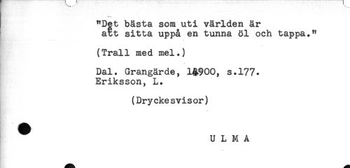 //// "Det bästa som uti världen är //// att sitta uppå en tunna öl och tappa." //// ... - t //// (Trall med mel.) //// Dal. Grangärde, 1&900, s.177. //// Eriksson, L. //// (Dryckesvisor) //// U L M A ////