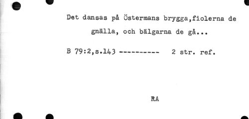 //// Det dansas på Östermans brygga,fiolerna de //// gnälla, och bälgarna de gå... //// B 79:2,s.143----- 2 str. ref. //// t. //// RA ////