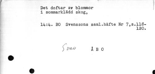 //// Det doftar av blommor //// i sommarklädd skog, //// ..... //// ,.... ... . //// 14:4* BO Svenssons saml.häfte Nr 7,s.118- //// 120. //// ^ ÅBO ////