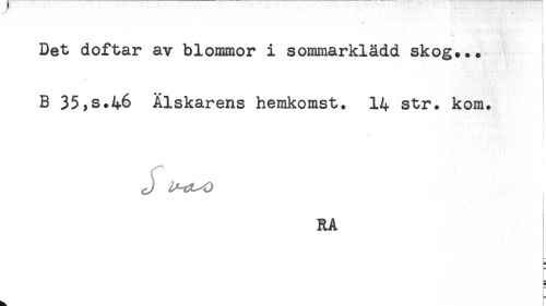 //// * . j //// ! //// Det doftar av blommor i sommarklädd skog... //// B 35^s.46 Älskarens hemkomst. 14 str. kom. //// ! //// < //// RA ////