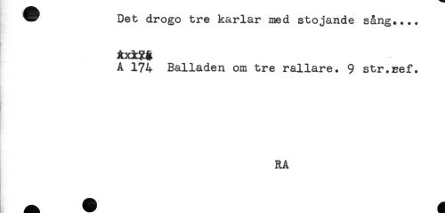 //// * Det drogo tre karlar med stojande sång.... //// Ax3g$ //// A 174 Balladen om tre rallare. 9 str.Bef. //// RA ////