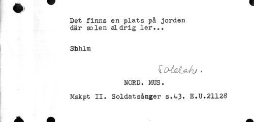 //// Det finns en plats på jorden //// där solen aldrig ler... //// Shhlm //// NORD. MUS. //// Mskpt II. Soldatsånger s.43. E.U.21123 ////