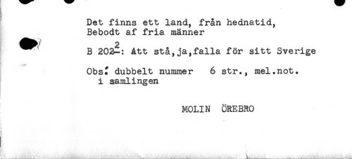 //// Det finns ett land, från hednatid, //// Bebodt af fria männer //// ^^ B 203^: Att stå,ja,falla för sitt Sverige //// Obs* dubbelt nummer 6 str., mel.not. //// i samlingen //// MOLIN ÖREBRO //// - ////