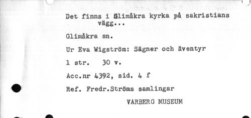 //// Det finns i Slimåkra kyrka på sakristians //// vägg... //// Glimåkra sn. //// Ur Eva Wigström: Sägner och äventyr //// 1 str. 30 v. //// - //// Acc.nr 4392, sid. 4 f //// Ref. Fredr.Ströms samlingar //// VARBER G MUSEUM ////