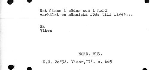 //// Det finns i söder som i nord //// varhålst en människa föds till livet... //// Sk //// Viken //// NORD. MUS. //// E.U. 2o"93. Visor,III. g. 665 ////