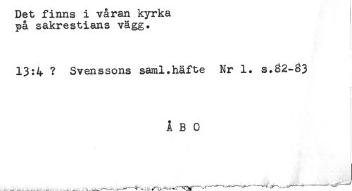 //// Det finns i varan kyrka //// på sakrestians vägg. //// 13:4 ? Svenssons saml.häfte Nr 1. s.82-83 //// ! //// } //// i //// < //// ÅBO ////