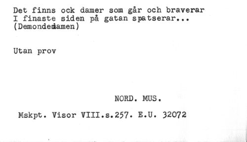 //// Det finns ock damer som gar och braverar //// I finaste siden på gatan spatserar... //// (Demondedamen) //// Utan prov //// NORD. MUS. //// Mskpt. Visor VIII.s.257. E.U. 32072 //// * ////
